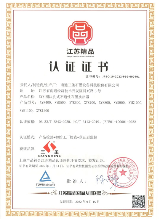 經(jīng)“江蘇精品”國(guó)際認(rèn)證聯(lián)盟認(rèn)證,南通三圣石墨設(shè)備科技股份有限公司榮膺“ 江蘇精品 ”認(rèn)證 ,成功躋身“江蘇精品”優(yōu)質(zhì)制造業(yè)品牌。