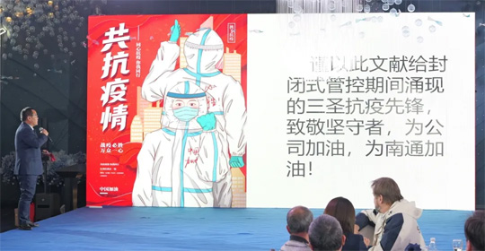 年會不只有歡樂,也有感動。施總監(jiān)通過一張張圖片,一段段文字又將我們帶回了那段艱難的歲月,回想起那時的艱苦卓絕,那時的眾志成城,那時的樂觀向上,我們的眼眶濕潤。